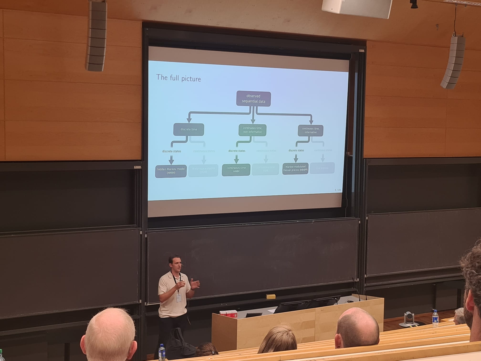 I presented the results of my master thesis which focussed on methods for mitigation the undesired consequences of the Markov assumption in hidden Markov models. In particular, I derived properties of the state process of periodically inhomogeneous Markov chains, and extended the model class of hidden semi-Markov models to allow for inhomogeneity in the state dwell-time distributinos. You can download the slides here.